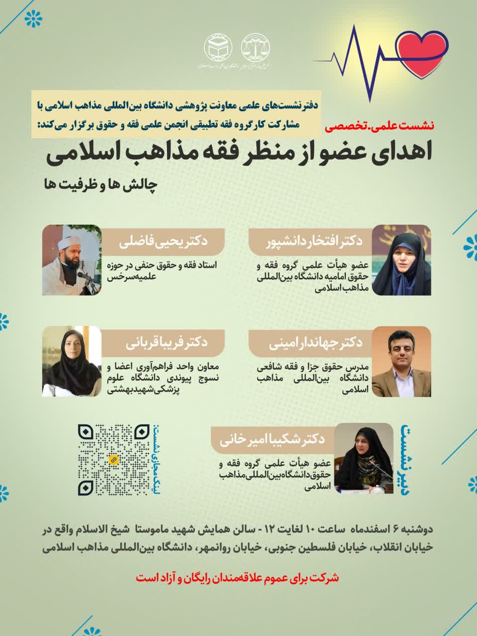 نشست علمی ـ تخصصی بررسی مبانی فقهی و حقوقی چالشهای اهدای عضو در میان مذاهب اسلامی دوشنبه ۶ اسفند برگزار می شود