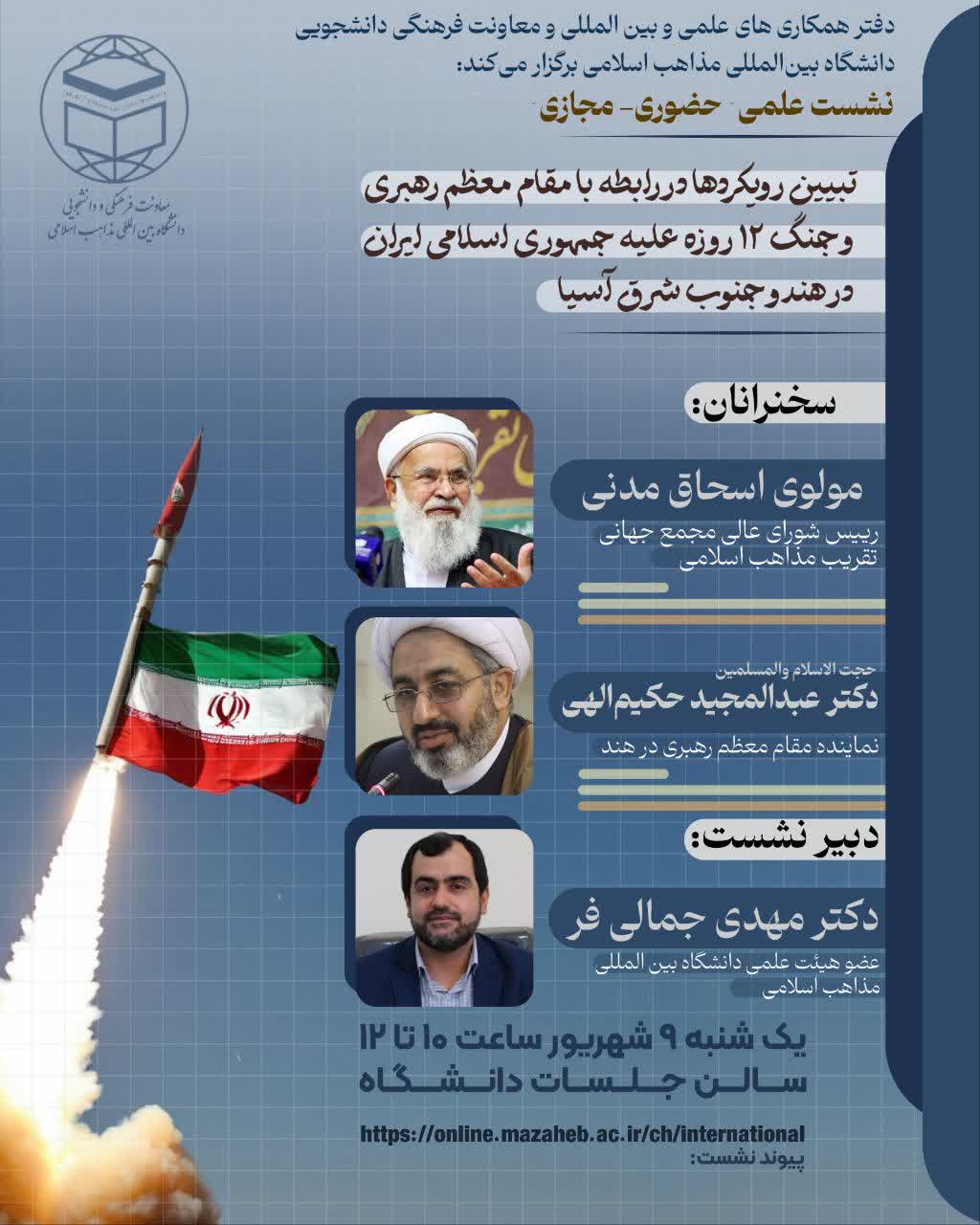 نشست علمی( حضوری- مجازی)  تبیین رویکردها در رابطه با مقام معظم رهبری و جنگ ۱۲ روزه علیه جمهوری اسلامی ایران در هند و جنوب شرق آسیا یکشنبه ۹ شهریور ساعت ۱۰ تا ۱۲ برگزار می گردد.