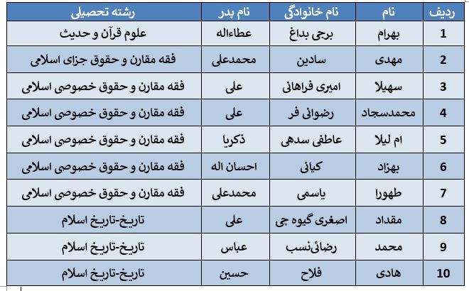دانشگاه بین‌المللی مذاهب اسلامی، ضمن تبریک به پذیرفته‌شدگان آزمون کتبی مقطع کارشناسی ارشد (اختصاصی طلاب)، اسامی پذیرفته شدگان نهایی را به شرح زیر اعلام می‌دارد.