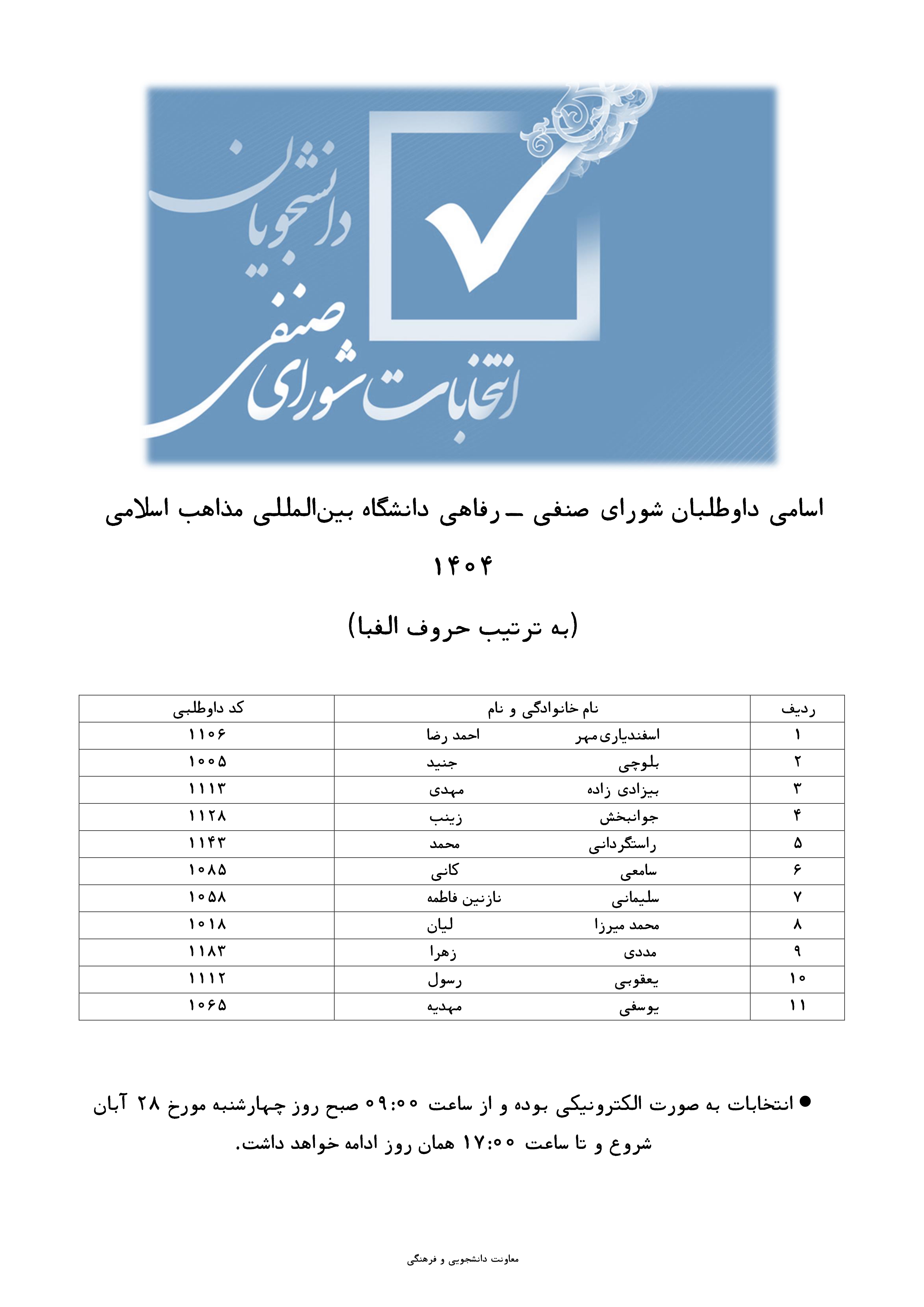 معاونت دانشجویی و فرهنگی دانشگاه بین‌المللی مذاهب اسلامی اسامی داوطلبان شورای صنفی ـ رفاهی را منتشر کرد.